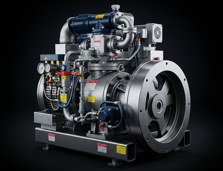 A marine compressor is a type of industrial compressor specifically designed for use on ships. It is a robust machine that can handle various tasks such as supplying air for starting the main engine and providing compressed air for tools and control systems.