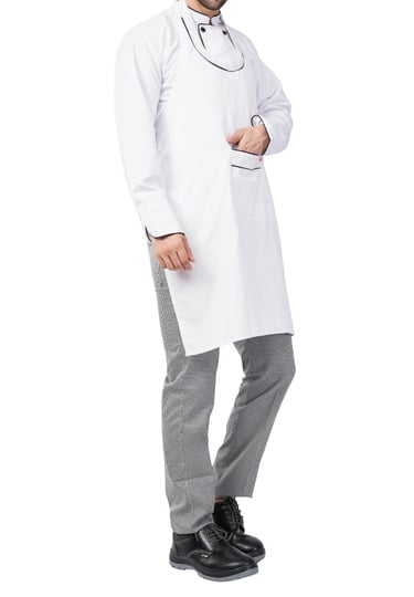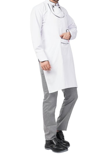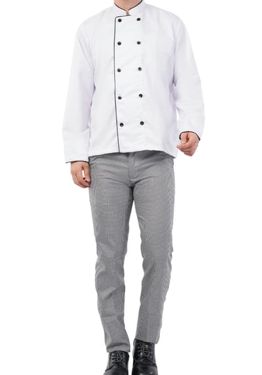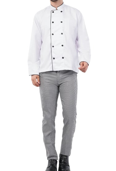 The Galley Uniform Set includes a Premium double-breasted chef coat, black chef pants, and a cook cap- crafted for comfort, hygiene and professional style. Made from a Breathable Polyester-Cotton blend, the full - Sleeve chef coat features a smart front closure with black piping and durable matching buttons. Designed to keep you stain-free and focused, this uniform allows ease of movement and long-lasting wear, even in hot kitchen environment.